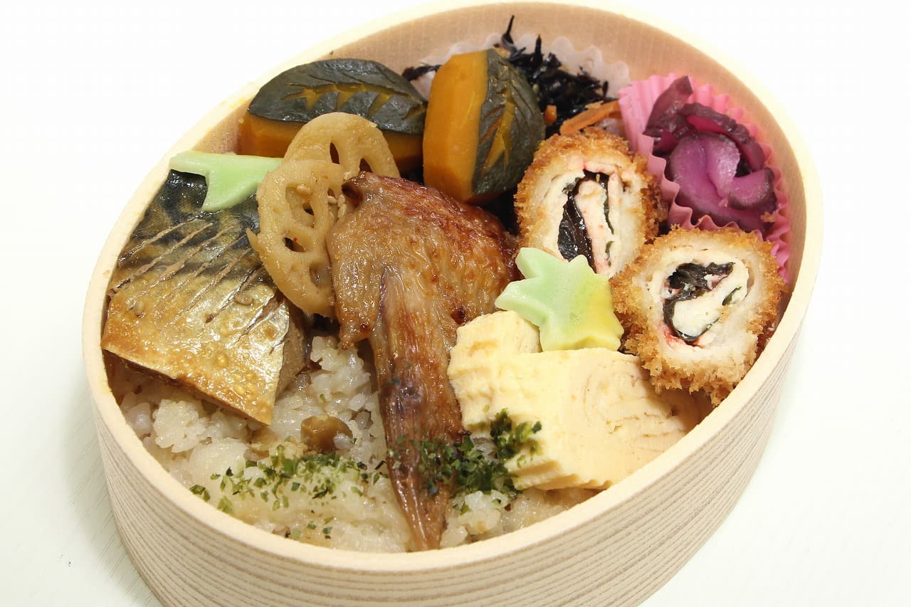 ふっくら炊いた栗ご飯に、照り焼きの手羽先やサバの生姜煮、出汁巻き玉子、カボチャの煮物、ササミのしそ揚げなどが彩り良く並びます。