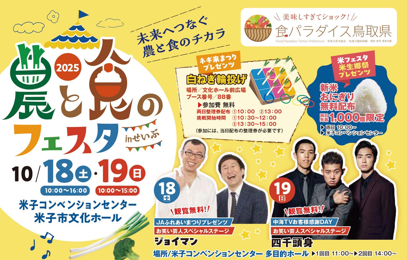 ざっくり内容 | 農と食をテーマに、鳥取県西部の4つの食まつりが集結する鳥取県最大級の食の祭典。会場には、たくさんのブースや店舗が並び、豊かな自然と水に育まれた「農や食」を、体感や満喫できる特色のあるイベントを多数開催します。 新米おにぎりの無料配布、白ネギがもらえる白ネギ輪投げほか、お笑い芸人スペシャルステージなど、家族みんなで楽しめる内容に。 |