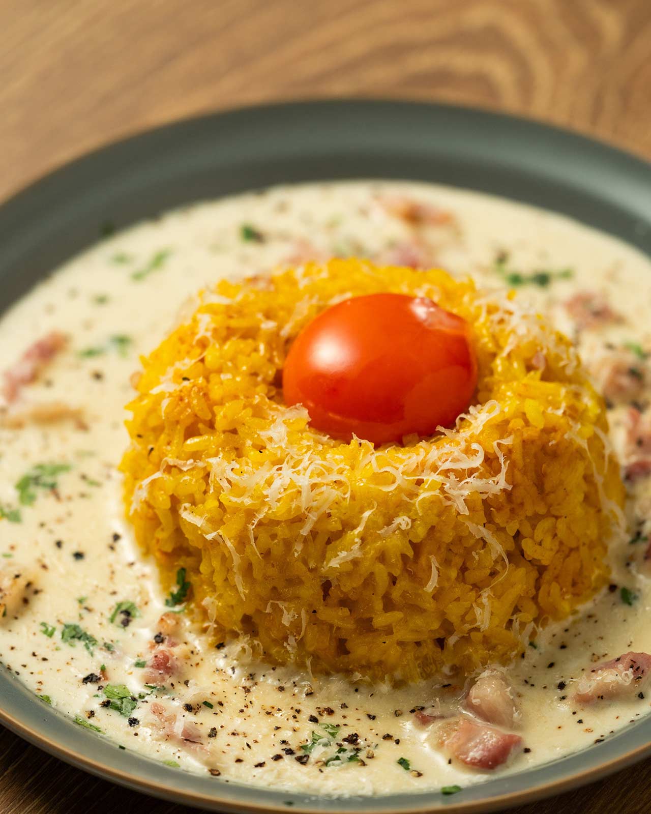 お昼の『フランク』を訪れたら、ぜひ味わって欲しいのが「龍のたまごとパンチェッタのライスカルボナーラ」。
