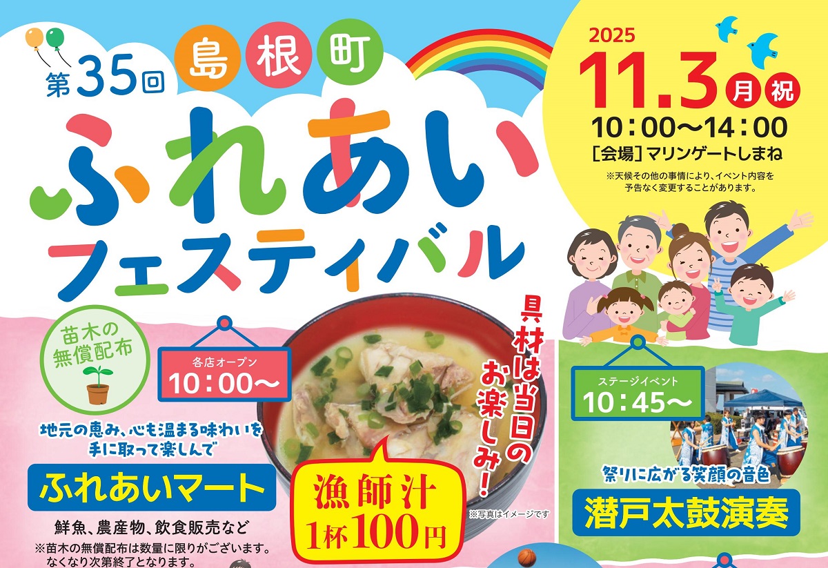 | ざっくり内容 | 農林水産物をはじめとした島根町の地域産品や郷土料理の販売、無料で参加できるお楽しみ企画が目白押し。秋の島根町を楽しみましょう! |
