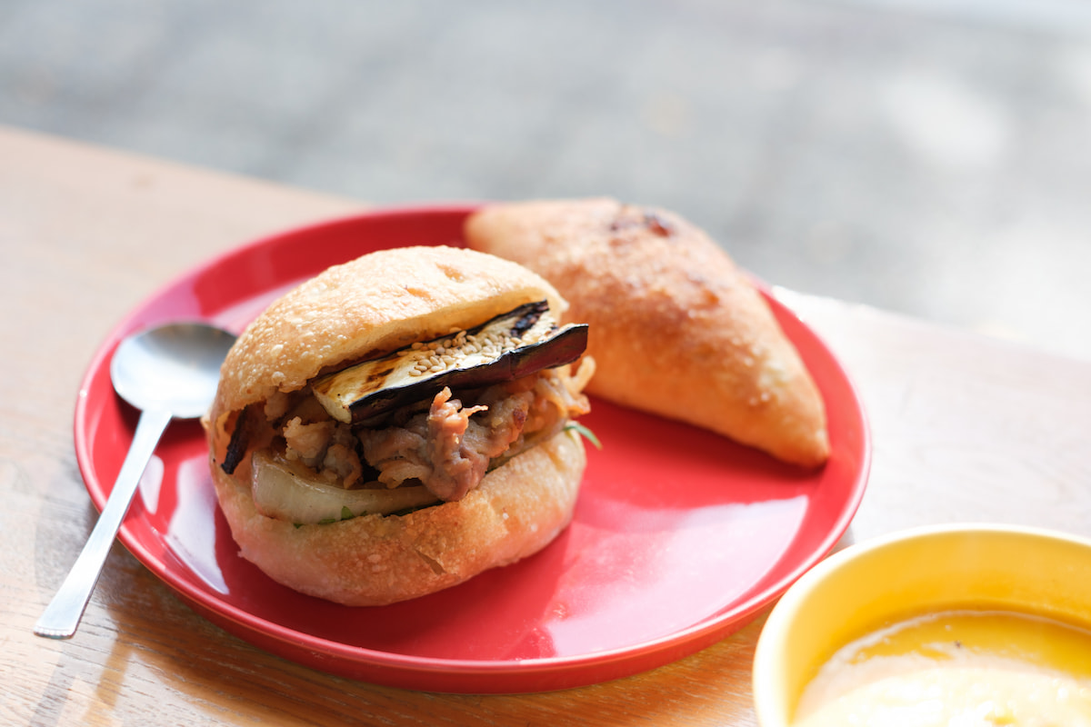 甘めのみそ味が絡んだ豚肉と、グリルした玉ねぎとナス、大葉の爽やかなアクセントが加わった満足感のあるサンド。