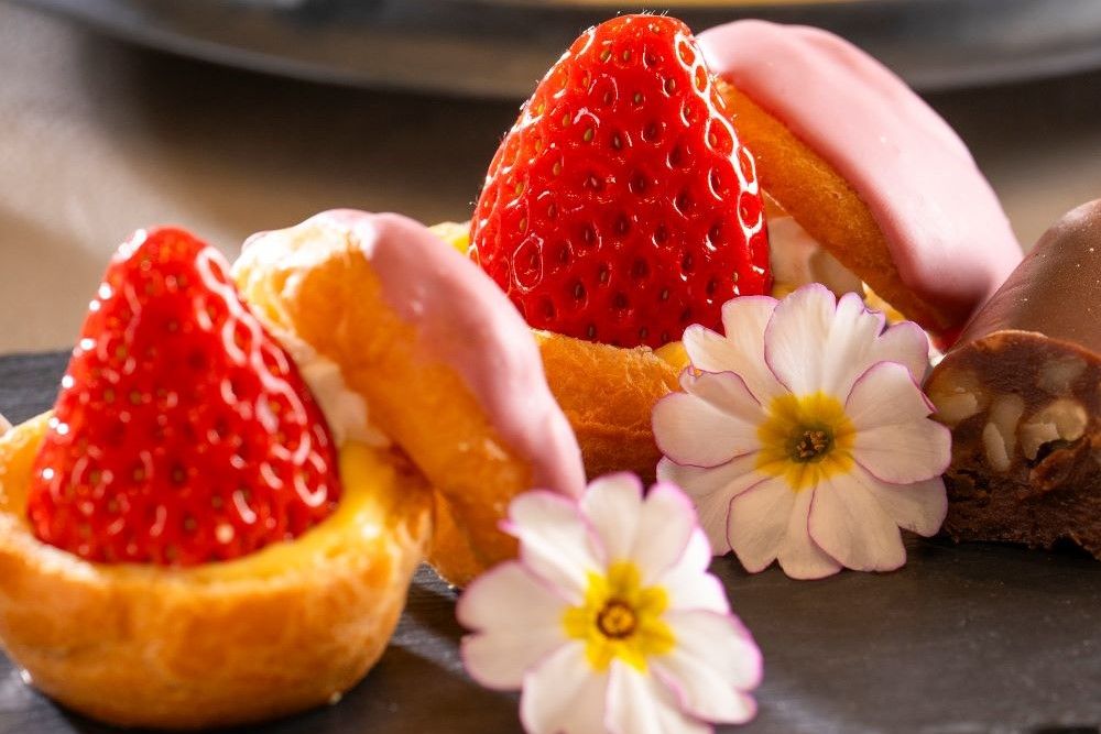 安来産紅ほっぺとルビーショコラを使ったエクレア、デコポンの寒天寄せ、苺のブラマンジェ、抹茶マカロン、ショコラファッジ、苺のブリュレ、スコーン、苺のコンフィチュール、クロテッドクリーム