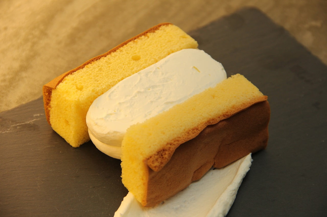 サンドされているクリームは、北海道産の低脂肪生クリームを使い、甘さ控えめに。