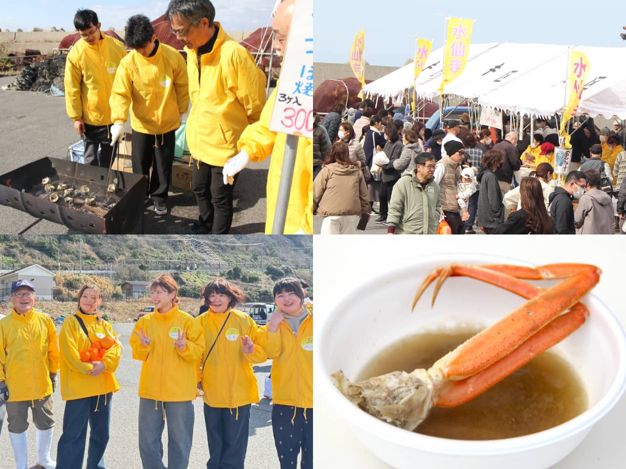 お手伝いするのは、サザエのつぼ焼き販売、カニ汁・水仙配布。