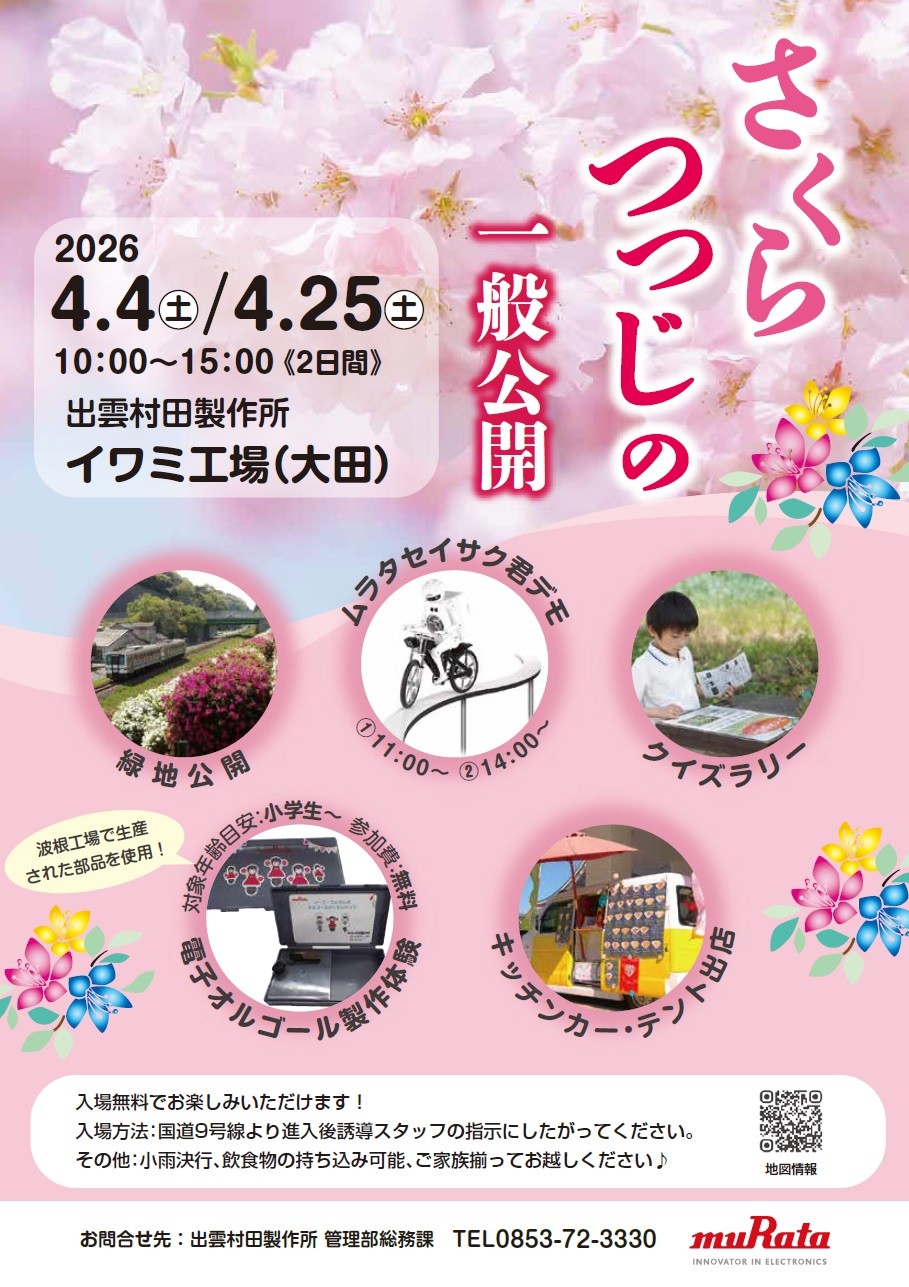 | 何がある? | 出雲村田製作所イワミ工場の敷地内に咲く、桜・つつじを一般公開。 当日は普段立ち入ることのできないエリアの緑地の散策、キッチンカー・テントの出店、ロボットのデモンストレーション、電子オルゴール工作教室なども実施予定です。 |
