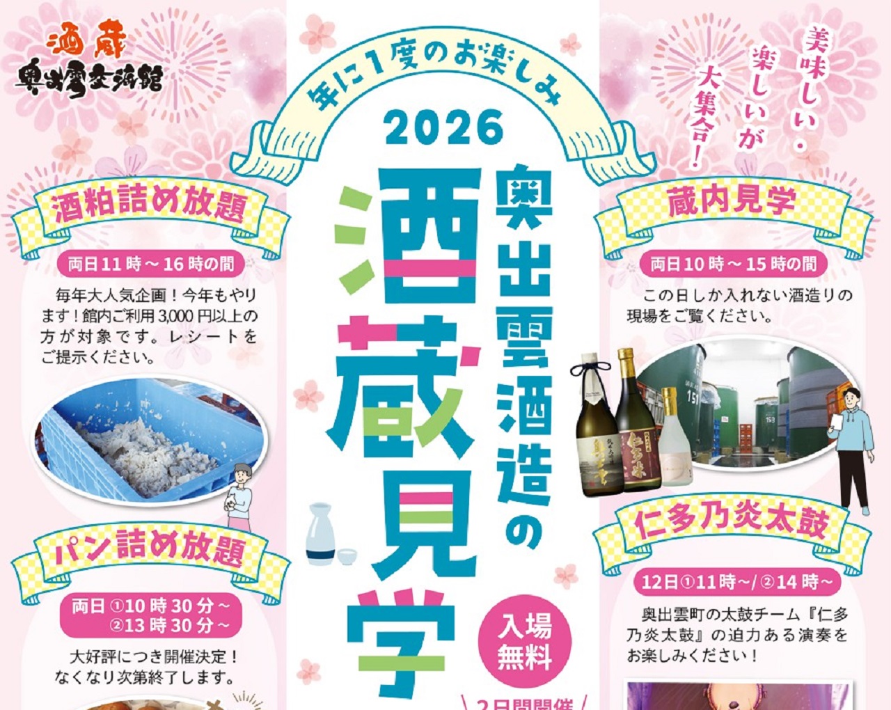| ざっくり内容 | 道の駅に隣接する『奥出雲酒造』の蔵見学ができる。 今年は地元の仁多乃炎太鼓を招いて盛大に実施。 このほか、3000円以上の買い物で参加できる酒粕詰め放題、大人気のパン詰め放題、お酒無料試飲、秘蔵限定酒の販売などなど、盛りだくさんの内容です。 |