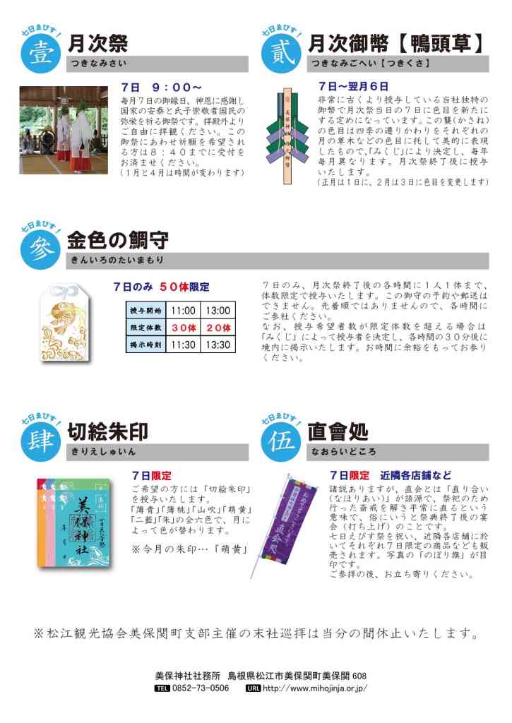 『美保神社』で毎月7日に行われるご縁日祭。9時から月次祭が行われ、「月次御幣 鴨頭草」や金色の鯛守(50体限定)が11時から30体、13時から20体授与される。全6色の「切絵朱印」は月ごとに色が変わり、10月は「萌黄」。また、参道では直会処としてキッチンカーなどが出店。