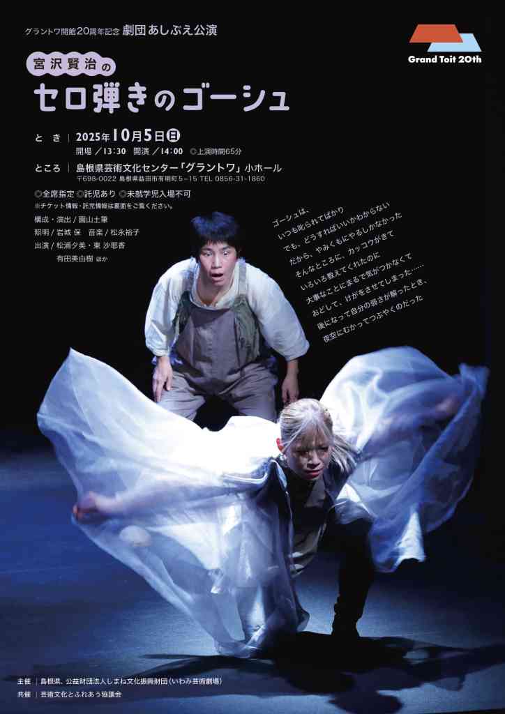 初演から36年、上演220回!世界で5万人が観劇し、アメリカ、カナダの演劇祭で6つの国際賞受賞した劇団あしぶえの代表作が、8年ぶりにグラントワにやってくる。子どもから大人まで楽しめ、国内外で高い評価を得ている作品をお見逃しなく。