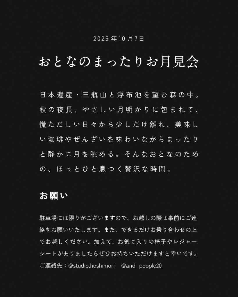 備考 | 申込・問合せ:Instagram(https://www.instagram.com/studio.hoshimori/)(https://www.instagram.com/and_people20/)にて受付 その他:駐車場には限りがあるため、来場の際は要事前連絡(可能な限り乗り合わせ推奨)。お気に入りの椅子やレジャーシートの持込可 |