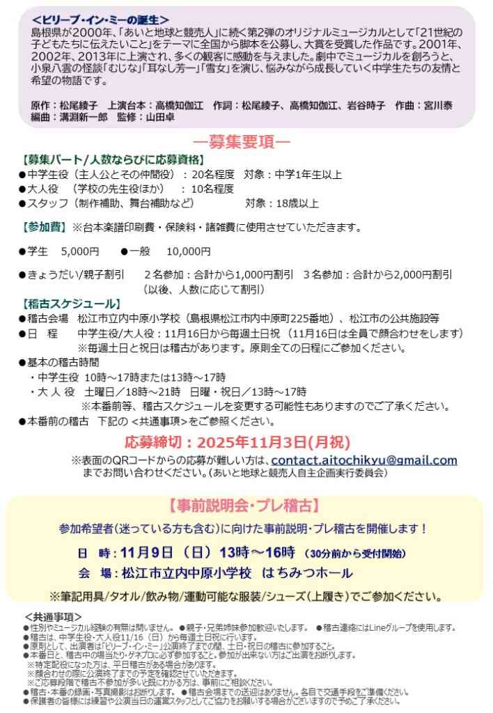 2001年の初演以来2002年、2013年と3回島根県で上演されて来たが、以後公演されないまま年月が経過。そしてこの度、あいと地球と競売人自主企画実行委員会は、13年ぶりに復活公演としてミュージカル「ビリーブ・イン・ミー2026」を手がけることになり、中学生役と大人役のキャストを募る。