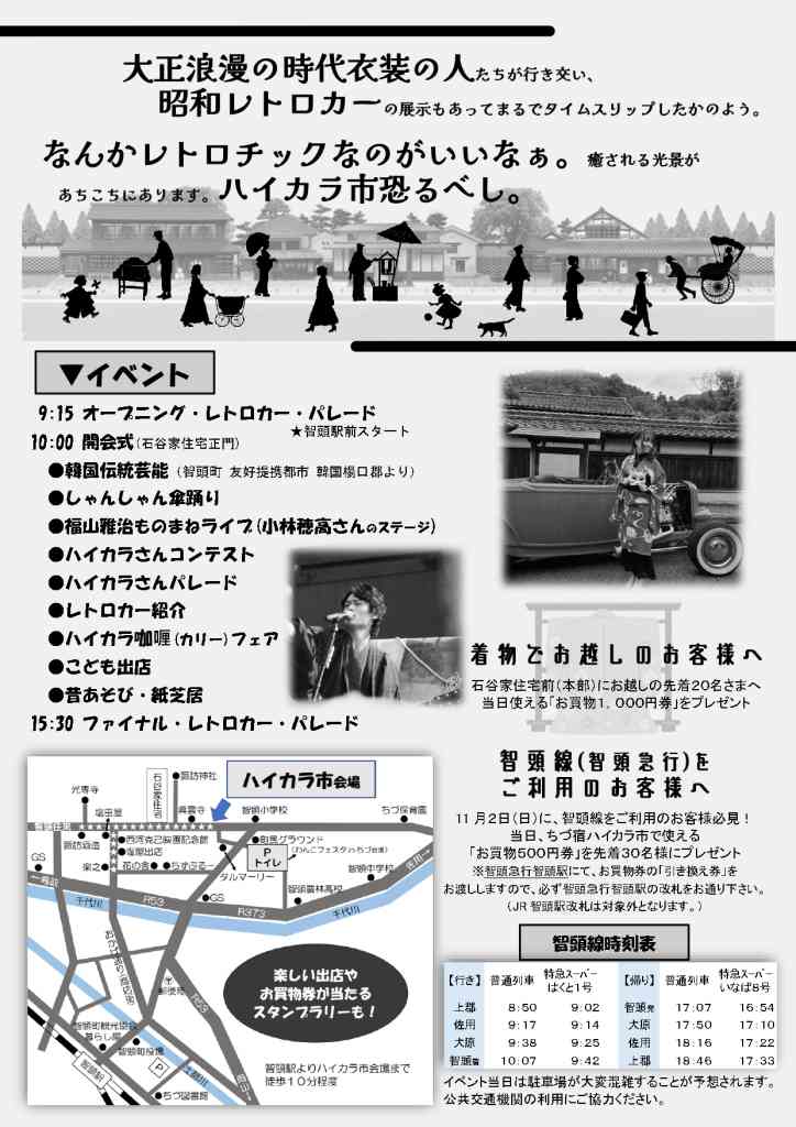 大正浪漫の色とりどりの着物を着たかわいいハイカラさんたちが競う「ハイカラさんコンテスト」をはじめ、昭和初期の麗しきレトロカーが町を走るレトロカーパレード、大道芸、ライブなど盛りだくさんの大人気イベント。