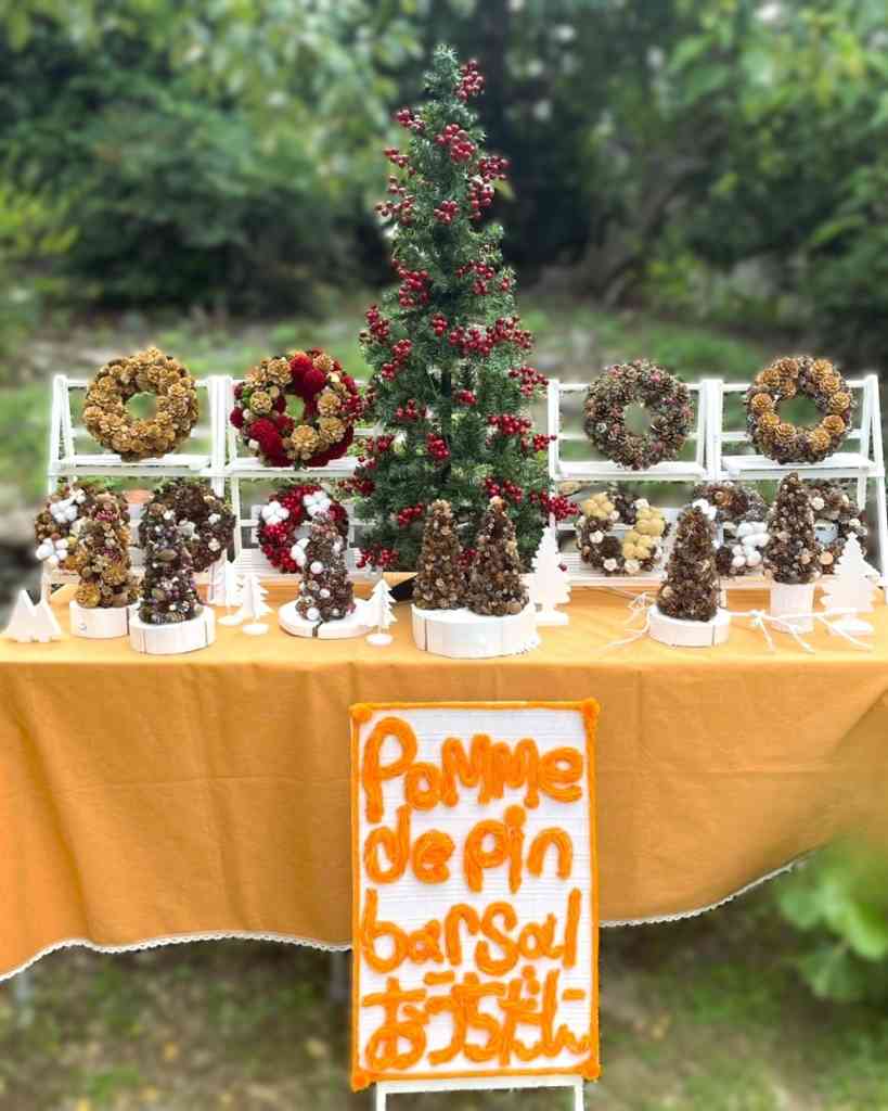 地元の松ぼっくり作家「pomme de pin barsal おうちだに」による、木の実と毛糸のリースとツリーを展示。