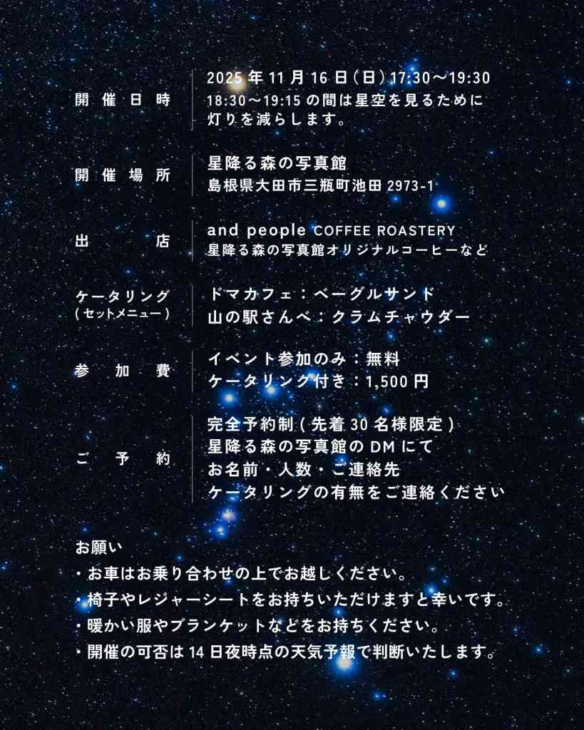| 備考 | 休み:開催の可否は14日夜時点の天気予報で判断 持ち物:椅子、レジャーシート、暖かい服装、ブランケットなど その他:定員先着30名。Instagram(@studio.hoshimori)DM、またはウェブサイトにて要事前申込(氏名、人数、連絡先、ケータリングの有無を記載)。 車で来場の場合、乗り合わせ推奨 |