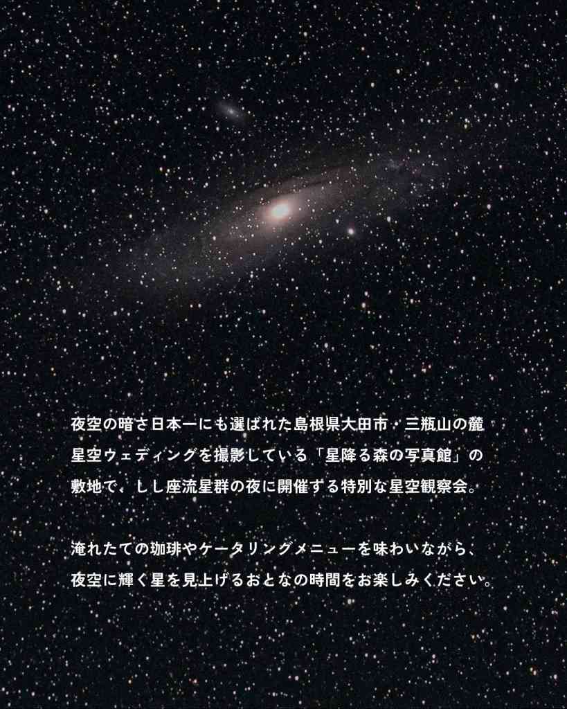 夜空の暗さ日本一にも選ばれた島根県大田市・三瓶山の麓。星空ウェディングを撮影している『星降る森の写真館』の敷地で、しし座流星群の夜に開催する特別な星空観察会。18:30〜19:15の間は灯りを減らすので、よりきれいな星空を満喫できそう。