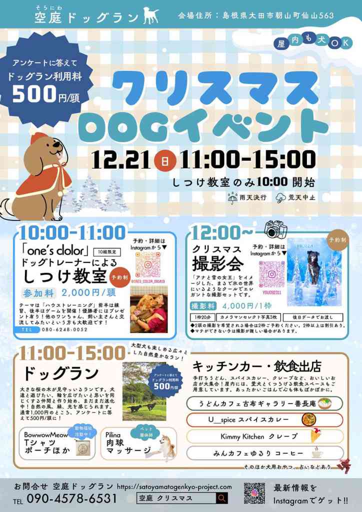 | 日程 | 12月21日(日)11:00~15:00※しつけ教室のみ10:00開始 |