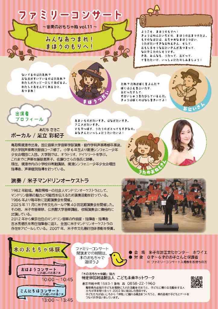 今回は、ボーカル 足立彩紀子氏、演奏 米子マンドリンオーケストラを迎え、歌って、踊って、手をたたいて、赤ちゃんから大人までみんなで一緒に楽しめるコンサートを楽しもう。