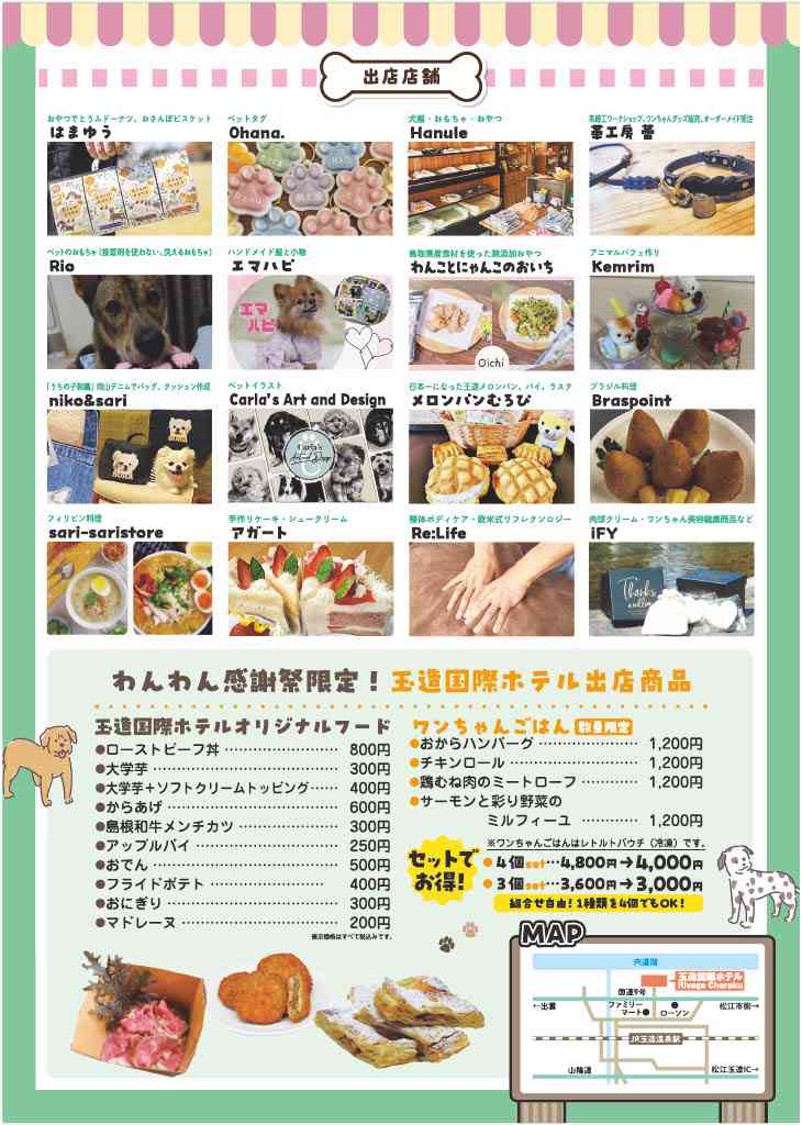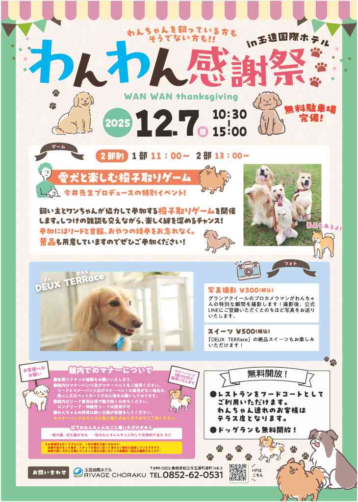 愛犬と楽しむ椅子取りゲームや写真撮影、ワンチャングッズのお店がたくさん!ドッグランも無料開放! 飲食店も多数出店予定で、わんちゃんを飼っている方も!そうでない方も!楽しい一日を過ごして。