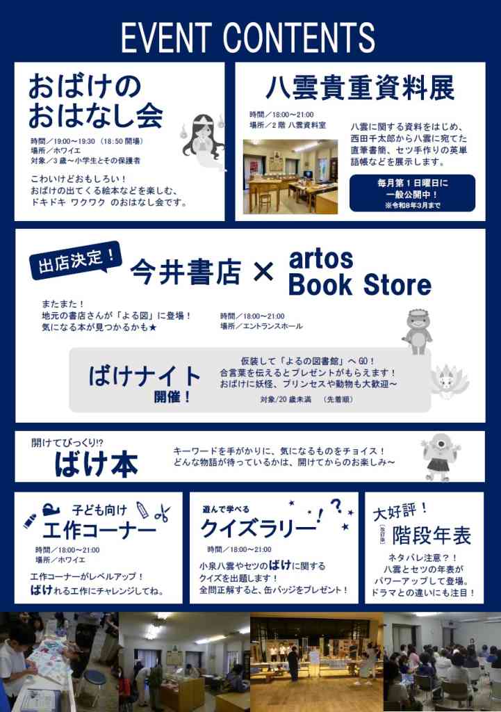 ・八雲貴重資料展 :八雲に関する資料をはじめ、西田千太郎から八雲に宛てた直筆書簡、セツ手作りの英単語帳などを展示する。(18:00~21:00 2階八雲資料室にて)