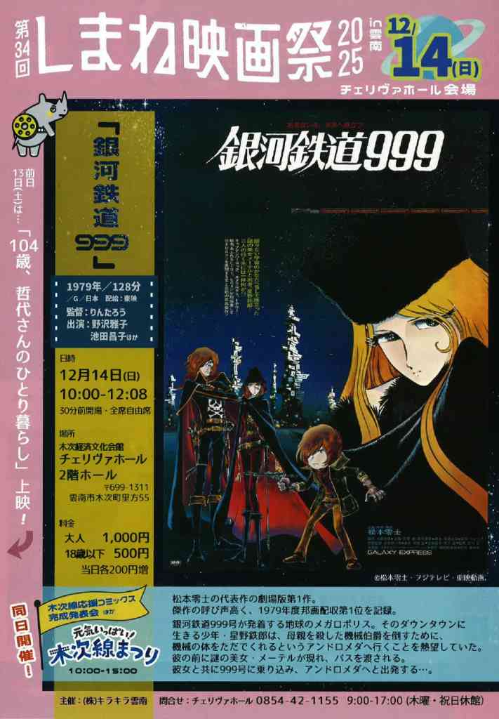 | 日程 | 【木次線まつり】12月14日(日)10:00~15:00【しまね映画祭】12月13日(土)10:30~12:04、14:00~15:34、12月14日(日)10:00~12:08 |