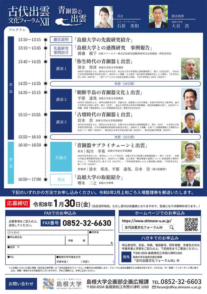 島根大学が主催する「古代出雲文化フォーラム」は古事記編纂1300年を記念して平成14年度から始まり、東京、広島、大阪、福岡、愛知など全国各地で回を重ね、12回目となる「古代出雲文化フォーラムⅫ」は初めて地元松江市での開催となる。