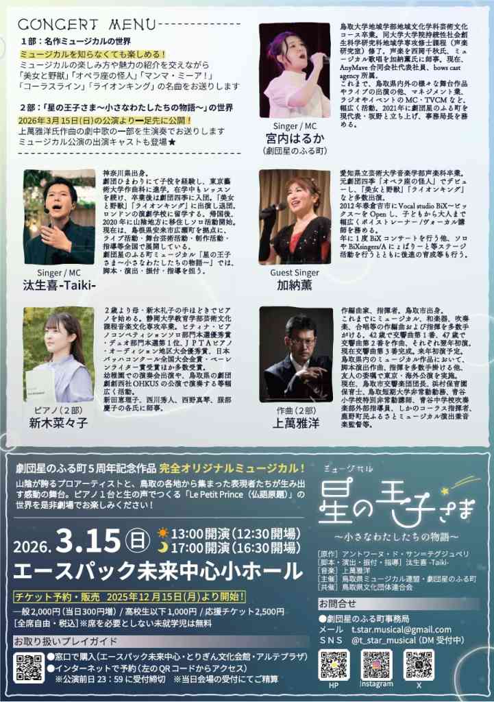 「劇団星のふる町」5周年を記念して制作されたミュージカル「星の王子さま〜小さなわたしたちの物語〜」の劇中歌を先行披露!さらに、ミュージカルの楽しみ方紹介から名作ミュージカルの歌唱まで、山陰のミュージカルアーティストがお届けする。