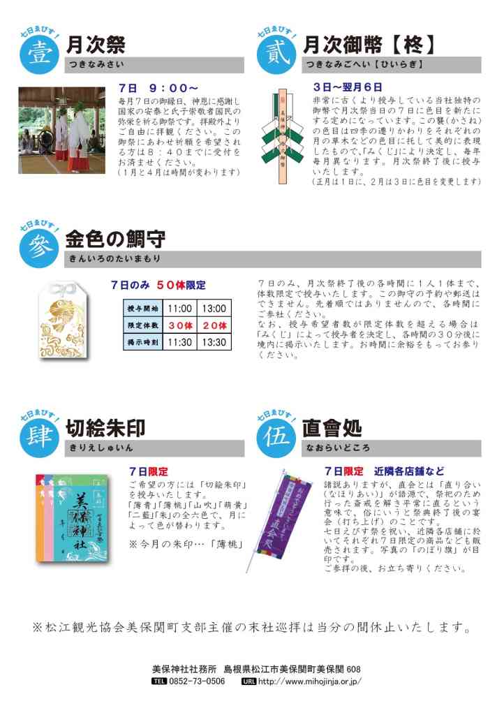 2月7日の「七日えびす祭」は、9時から月次祭が行われ、「月次御幣 柊」や金色の鯛守(50体限定)が11時から30体、13時から20体授与される。全6色の「切絵朱印」は月ごとに色が変わり、2月は「薄桃」。