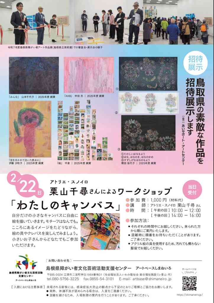 令和7年度島根県障がい者アート作品展受賞作品(金賞2作品、銀賞3作品、銅賞5作品、佳作46作品)をはじめ、 鳥取県の 「あいサポート・アートセンター」 の協力による招待作品7点を展示。