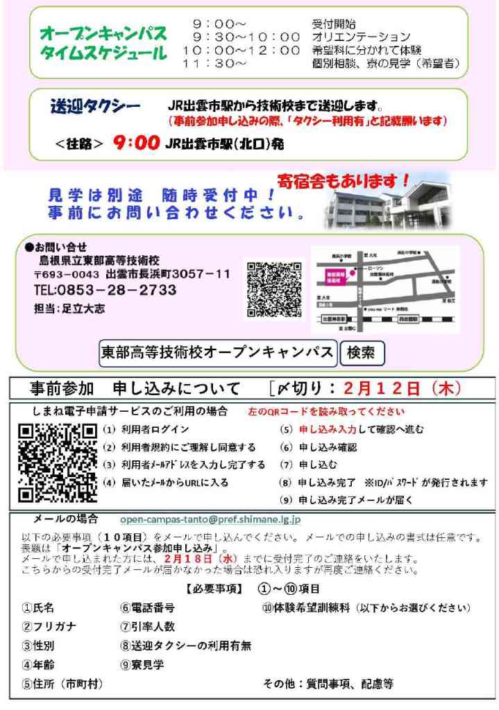 | 備考 | その他:HP内のしまね電子申請サービス、またはメール(open-campus-tanto@pref.shimane.lg.jp)にて要事前申込 |
