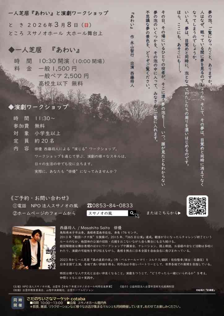 | 料金 | 鑑賞大人1500円、大人ペア2500円、高校生以下無料【演劇ワークショップ】参加無料※電話、または申し込みフォームより要事前申込(共通) |