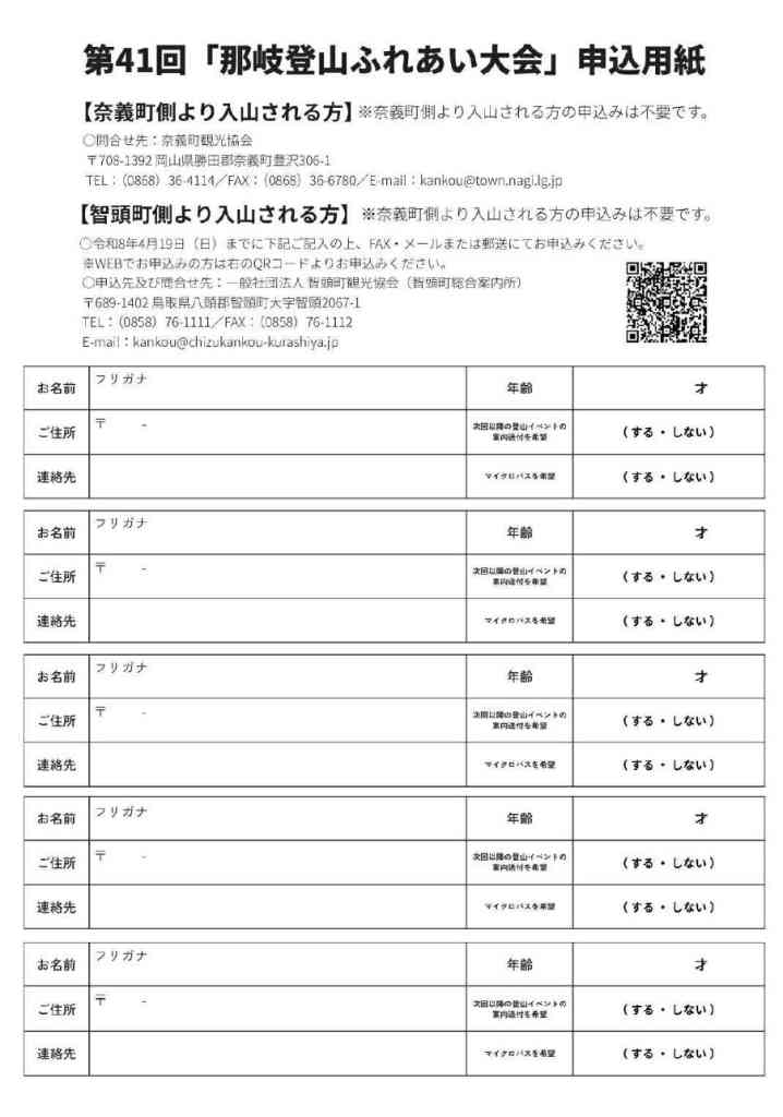 | 料金 | 参加500円※智頭町側からにコースは4/19までに要事前申込、奈義町側からのコースは予約不要 |