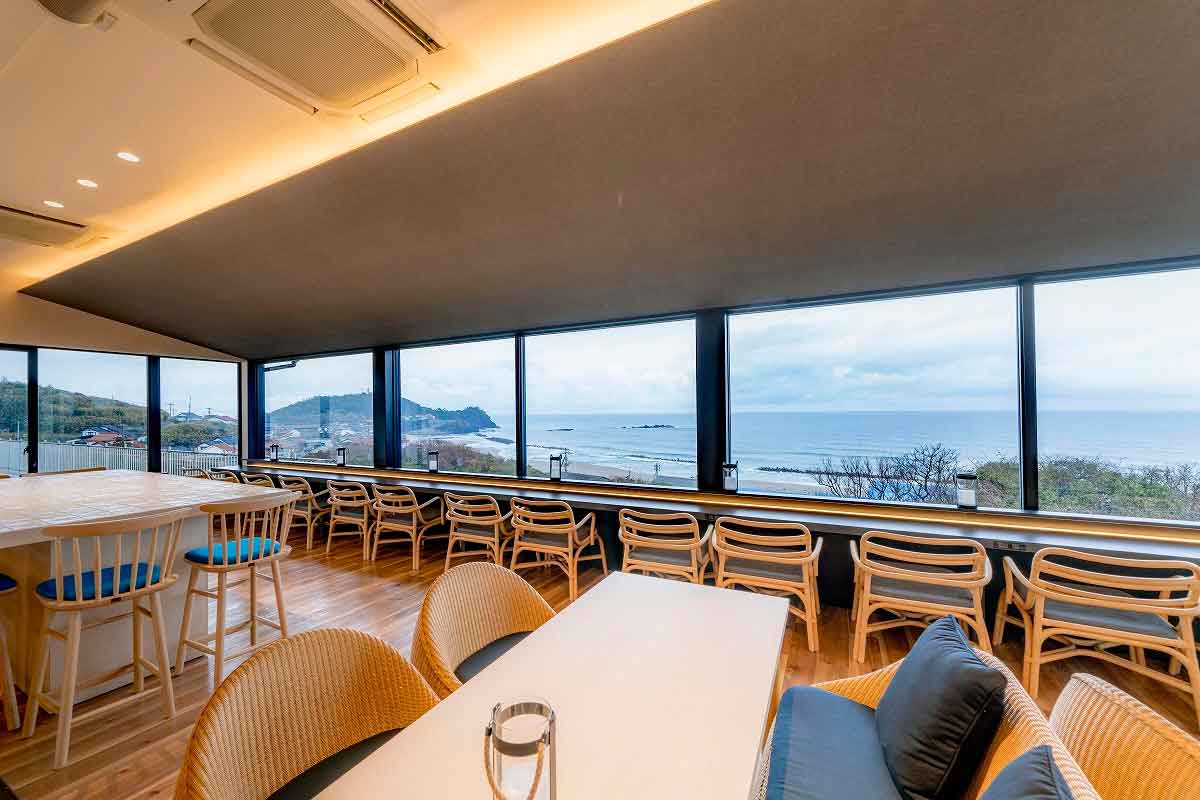 店内に「VIEW&CAFE SHINWA」が新しくオープンしました。店内からも紺碧の日本海を一望できます。海に向かって座れるカウンター14席、ソファ8席、ビックテーブル8席の合計30席あり、外のデッキテラス席も利用できます。