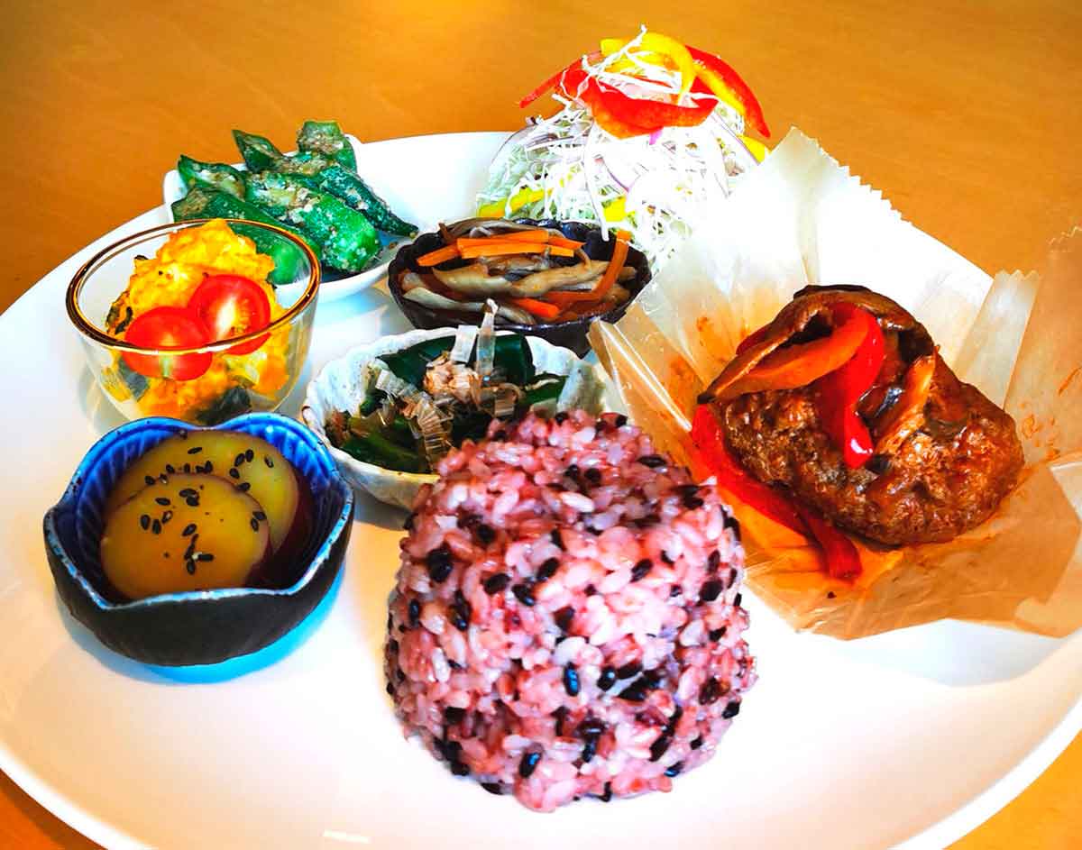 日替わりの「プレートランチ」(1100円)は、「ハンバーグ」などのメイン料理に加えてお惣菜5品、スープ、ごはん、漬物と品数豊富で栄養バランスも◎。