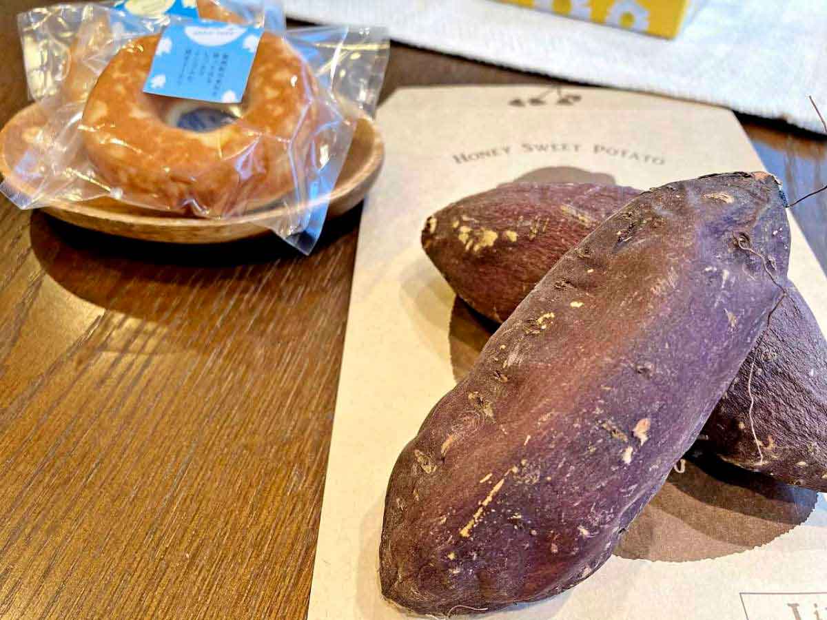 焼きドーナツや焼き立ての「森の絹」の焼き芋を購入して、店内で味わうのもオススメ。