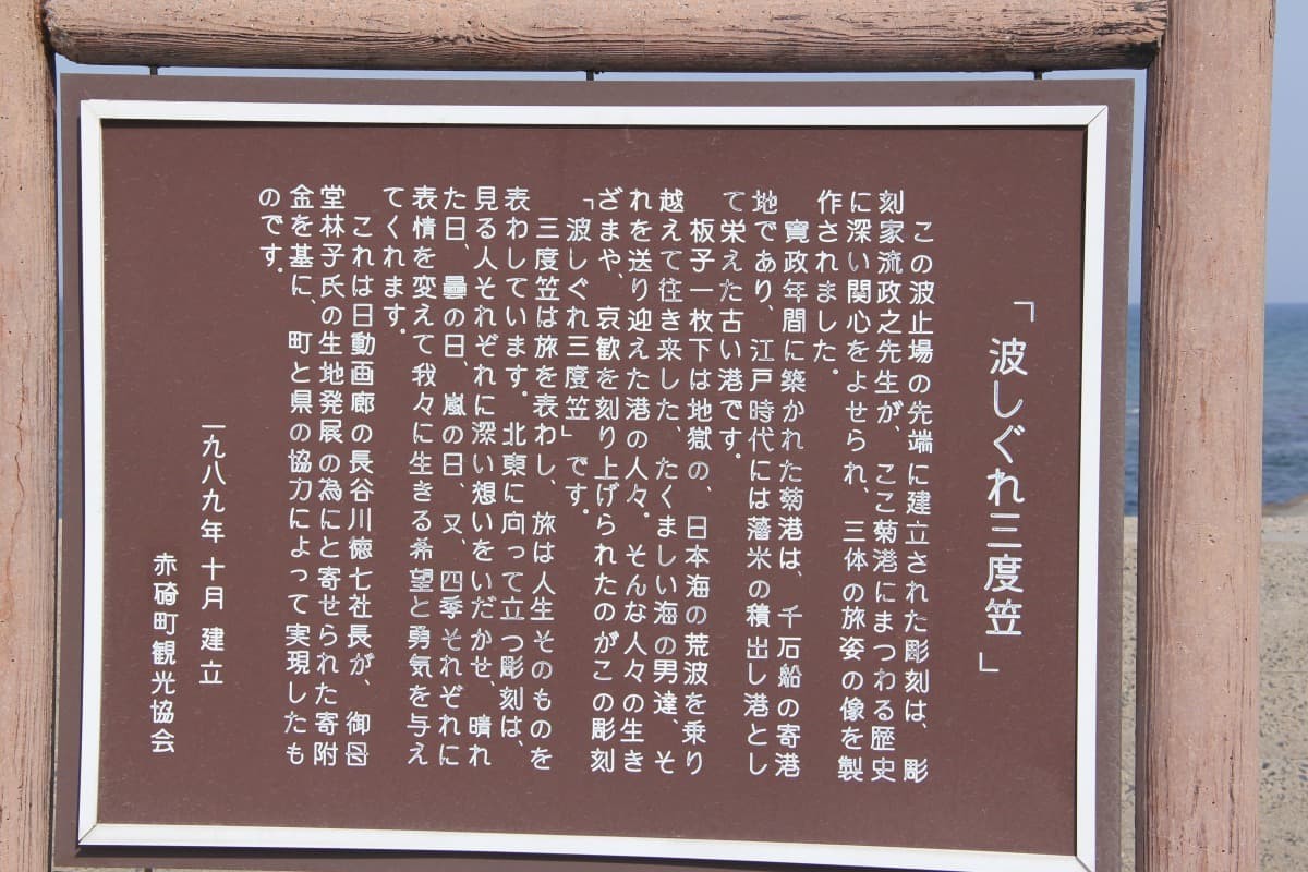 『波しぐれ三度笠』があるここ「菊港」はかつて、江戸時代には藩米の積出港として栄えた場所。日本海の荒波を越えてやってきたたくましい男衆、そして港の人たち、そういった人々の生きざまなどを表現したのがこちらの『波しぐれ三度笠』とのこと。
