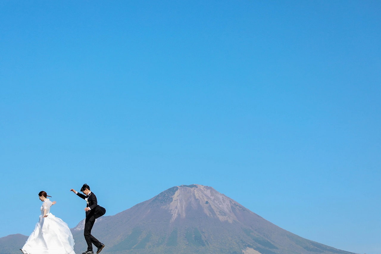 大山をバックに記念撮影。一生に一度のこの一瞬を美しく残そう