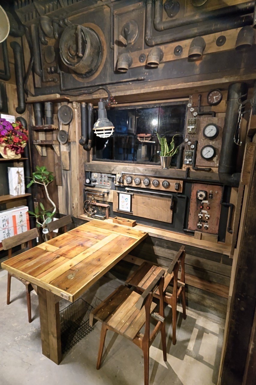 イスやテーブルなどには、解体の際に出た廃材を再利用。サスティナブルだし、お店の世界観にも合ってますね。