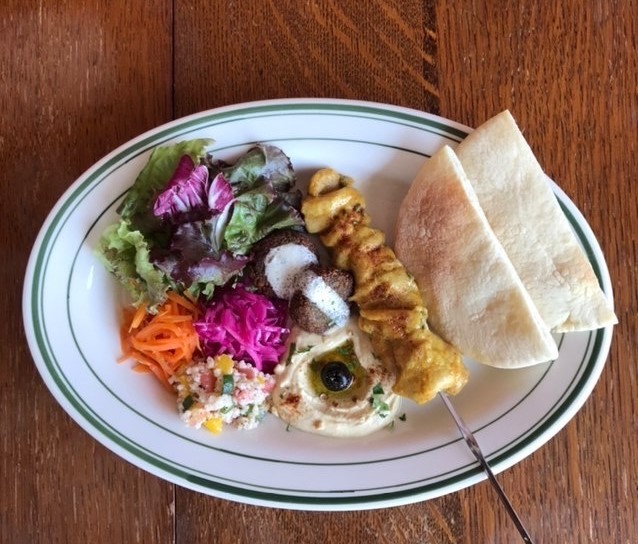 ひよこ豆をペースト状にした「フムス」やトルコの焼き鳥「ケバブ」など、イスラエル料理を中心としたスパイシーメニューが彩る「中東プレート」もぜひお試しあれ~。手作りのピタパンにはさんでいただきます!