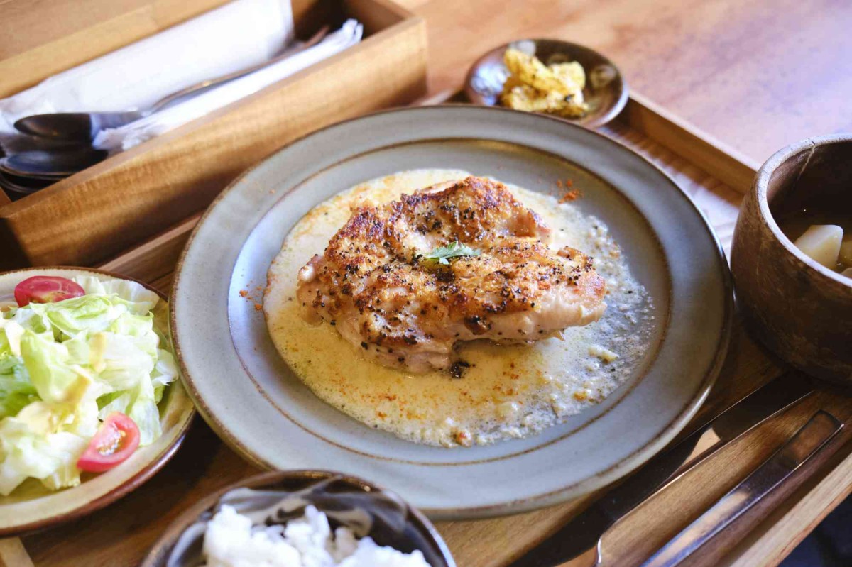 「シュクメルリ定食」は、鶏肉をガーリックが効いたクリームソースで煮込んだ、ジョージアの伝統的な料理のひとつ。クリームソースなのでやさしい味を想像しますが、ひと口食べてみると、ニンニクがしっかり効いたパンチのある味で、メチャクチャお米が進みます・・・!