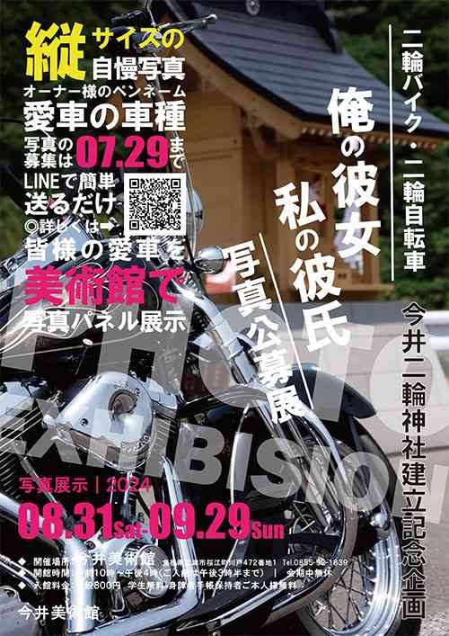| ざっくり内容 | 今井二輪神社建立記念企画として、二輪バイク・二輪自転車 俺の彼女・私の彼氏写真公募展を行います。是非、自慢の愛車を所有の方、奮って応募しましょう。 |
