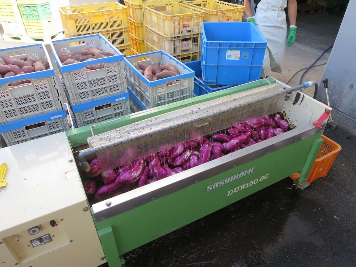 まずは『稲田本店』による芋洗いからスタート。こちらの機械で1分30秒ほどサツマイモを洗って土を落とします。