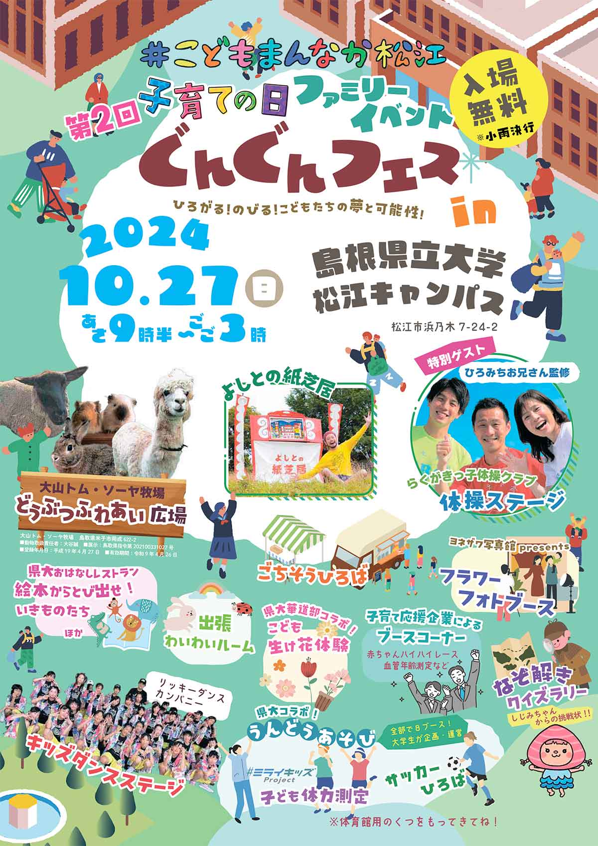 2024年10月27日(日)、島根県立大学松江キャンパスにて「第2回子育ての日ファミリーイベント ぐんぐんフェス」が開催されます!