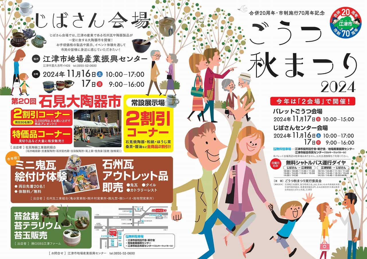 | ざっくり内容 | 江津市の色々な産業が元気に発展していくお手伝いを目的として開催する「ごうつ秋まつり」。今年は2会場で開催! じばさん会場では、江津の産業である石州瓦や陶器製品が一堂に会する大陶器市を実施。お手頃価格の製品もあり、展示、イベント体験を通して江津市が誇る伝統工芸品を身近に感じてください。またミニ鬼瓦絵付け体験もあります。 パレットごうつ会場では、江津市で頑張っている企業や市民団体が活動を発表したり、商品を販売。江津市で頑張るお店の出店、江津市で生まれた素材を使った食べ物や商品を大発表します! |
