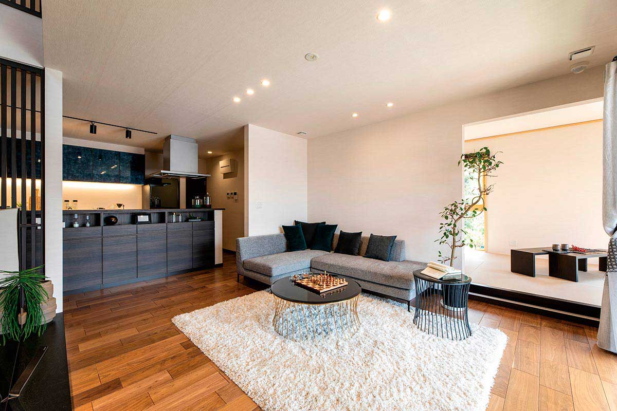ウッドデッキに隣接する和室は扉をなくしてリビングより床面を一段高くした独創的な造り。リビングのオプション的に使える点も注目です。