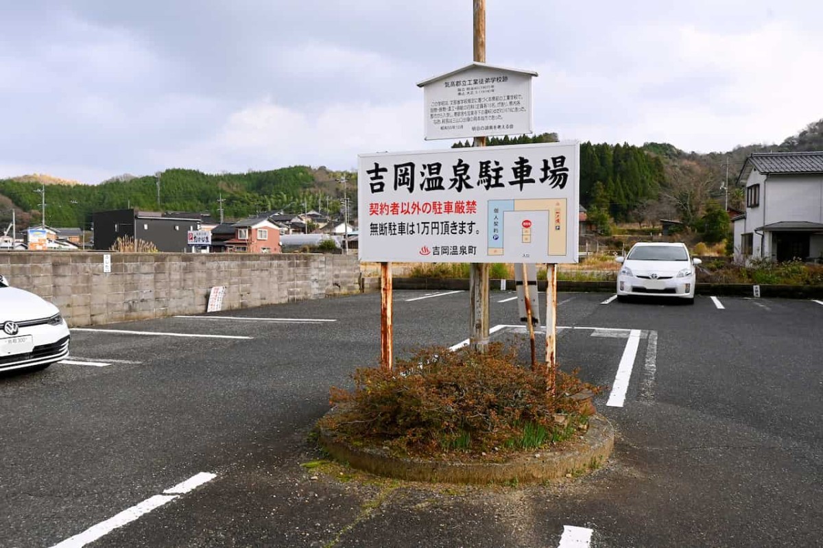 車は『一ノ湯』第3駐車場へ。「吉岡温泉街を散策される方もご利用ください」と親切です。