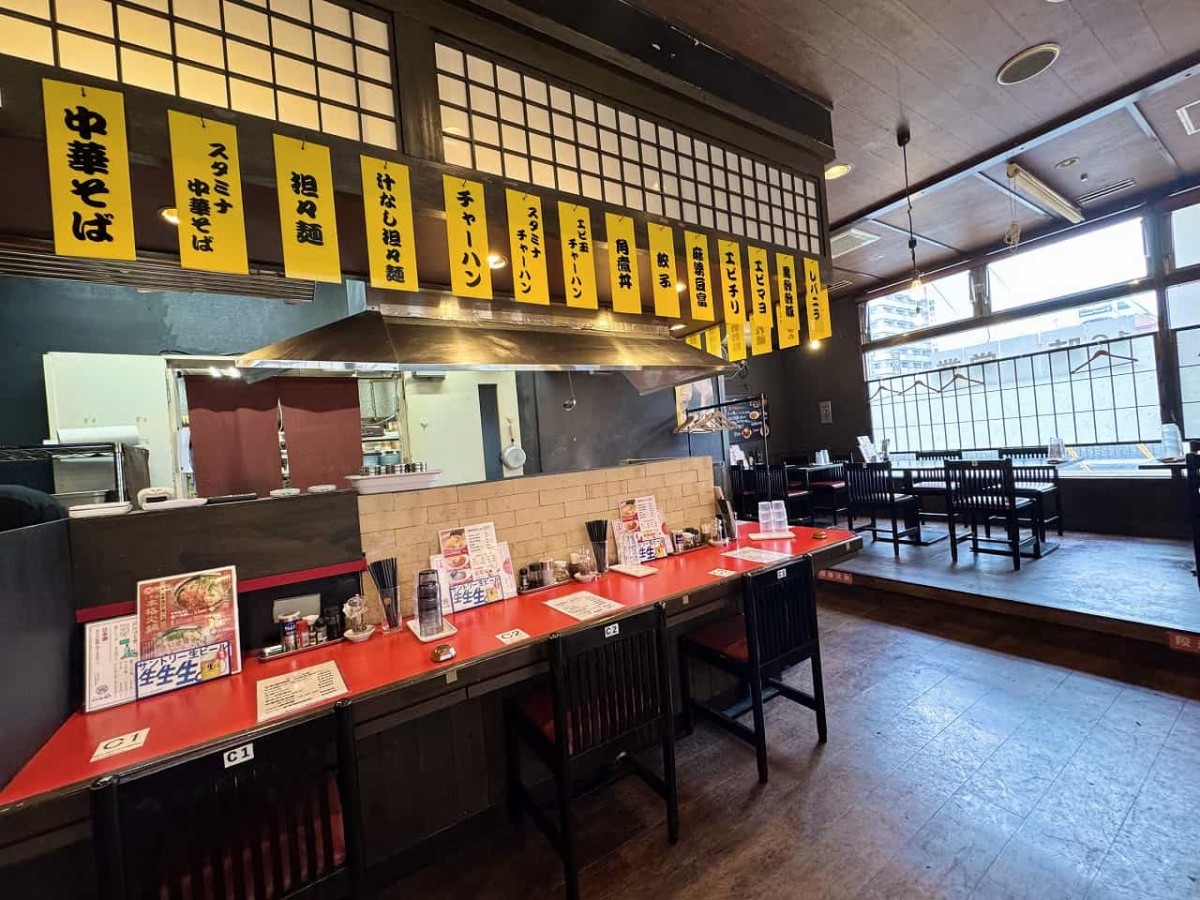 赤いテーブル、黄色いメニュー札がどこか懐かしい町中華の雰囲気を演出しています。日によってはカウンター席から埋まる時もあるとか。