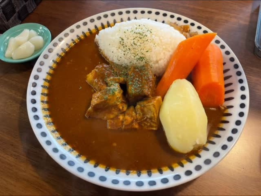 じっくり煮込まれたお肉は柔らかくホロッホロ。サラサラのルーやライスとの馴染みがよく、満足感の高いひと皿です。