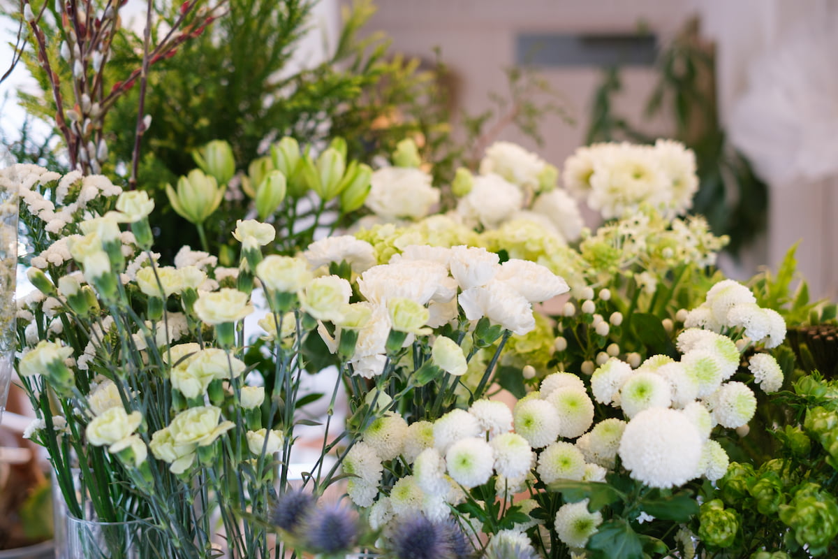 白や緑の草花が並び、日常から特別な日までそっと寄り添ってくれるフラワーショップです。