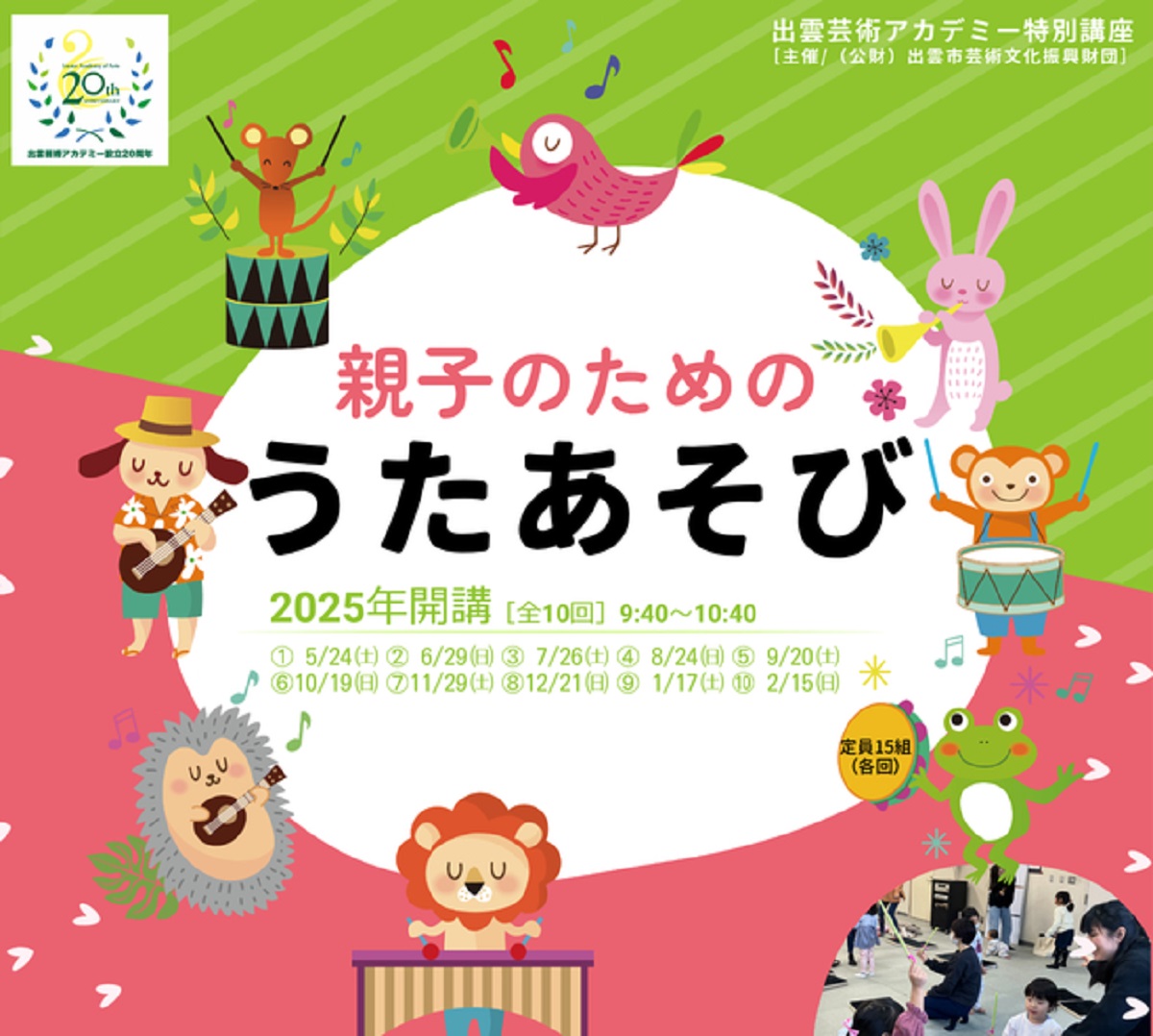 | ざっくり内容 | これまで、出雲芸術アカデミー音楽院の通常講座として開講していた親子対象の「うたあそび」の講座を、今年度から特別講座として開催!年間10回の開講で毎回申込制のため、都合に合わせて参加してみて♪ |