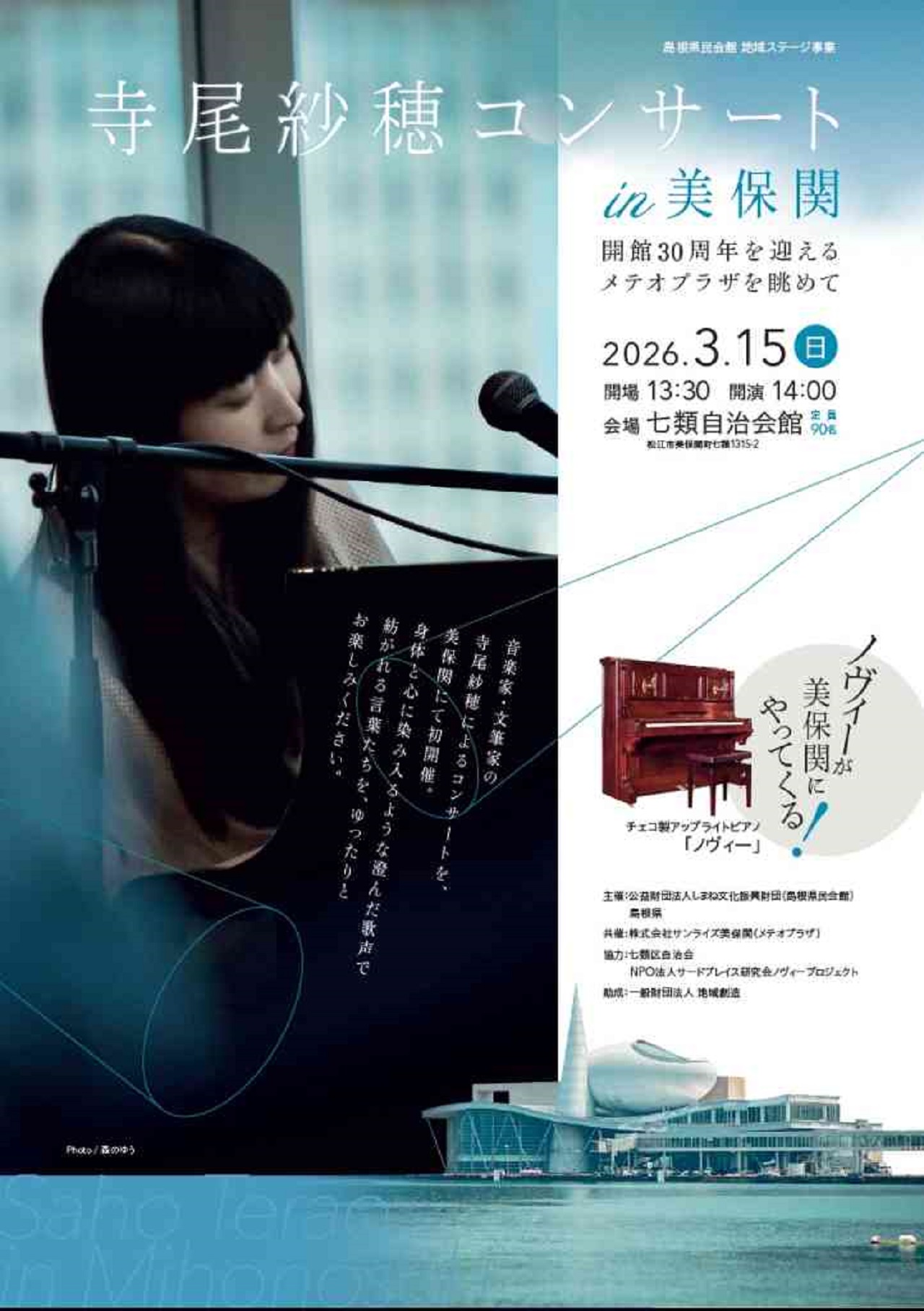 | ざっくり内容 | 音楽家・文筆家の寺尾紗穂によるコンサートを美保関にて初開催。 身体と心に染み入るような澄んだ歌声で紡がれる言葉たち、チェコ製アップライトピアノ「ノヴィー」による美しい音色を楽しんでください。 また『メテオプラザ』にて、「第29回美保関町のヤブ椿・盆栽展」(3/14 10:00~17:00、3/15 10:00~16:00)を同時開催!清楚なヤブ椿の魅力も体感してください。 |