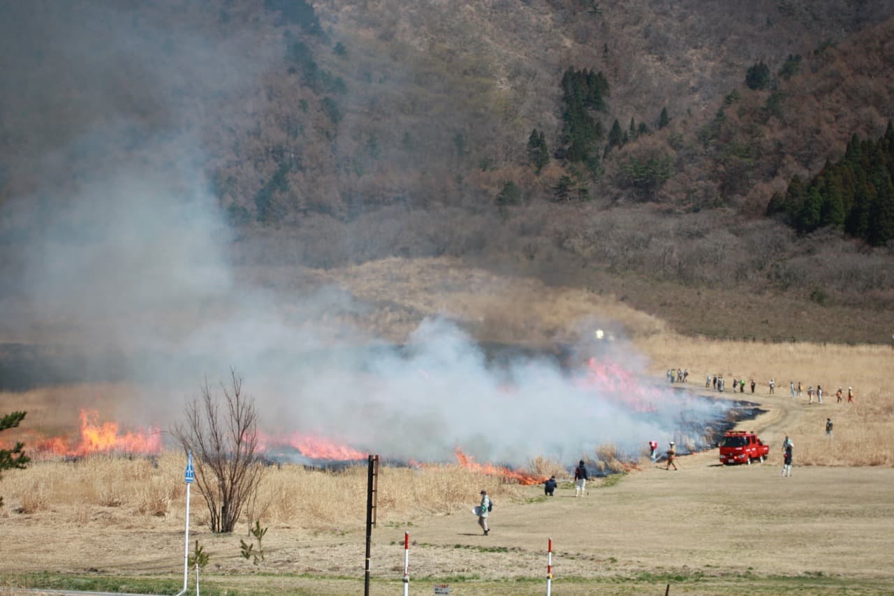 枯れ草や低木を焼くことで森林化を防ぎ、燃えた灰は春の新芽を育てる養分に。大田市の安全管理のもとで行われる、環境保全の取り組みでもあります。